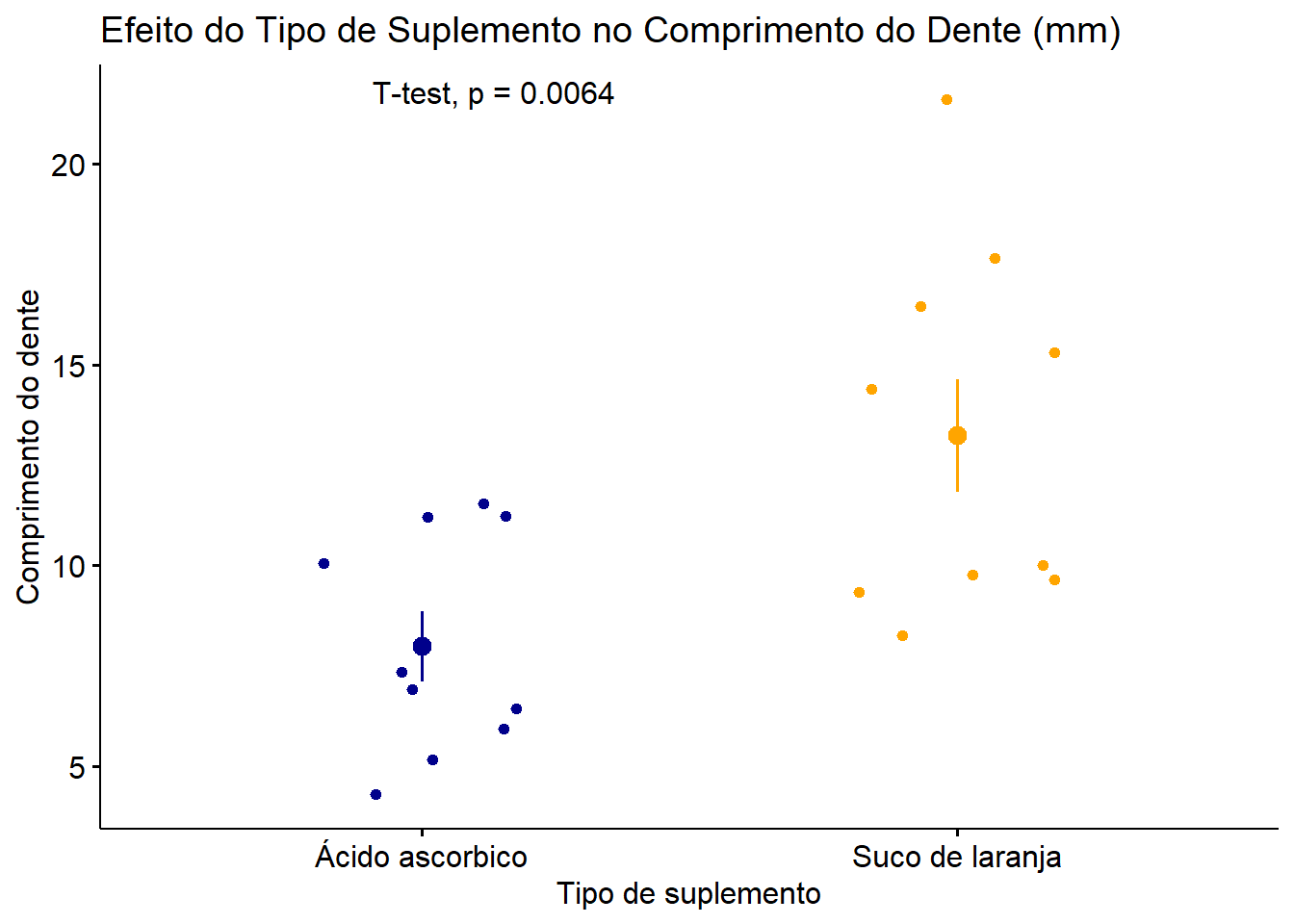 Os resultados indicam que o comprimento médio do dente foi significativamente maior nas cobaias que receberam suco de laranja (13,2 ± 4,5 mm) em comparação com aquelas que receberam ácido ascórbico (8,0 ± 2,7 mm). A diferença média entre os grupos foi de -5,3 mm, com um intervalo de confiança de 95% de -8,8 a -1,7 mm. Esse resultado foi estatisticamente significativo (t = -3,17, p = 0,006), conforme o teste t com correção de Welch, sugerindo que o tipo de suplemento influencia o comprimento do dente.